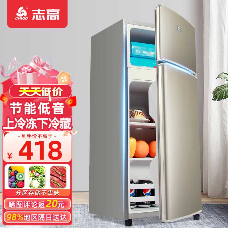 志高(CHIGO)小冰箱 双门宿舍租房小户型家用 冷藏冷冻双开门 迷你电冰箱节能保鲜低噪BCD-82A150D 金色价格:448.00元!