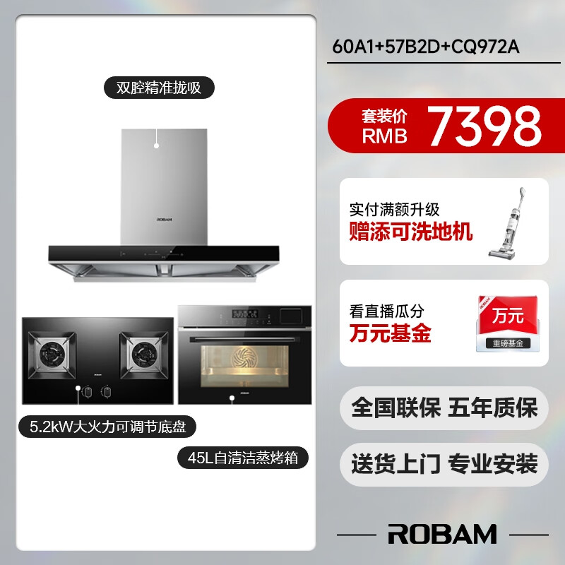 老板(Robam)60A1+57B2DT+CQ972A烟灶蒸烤套装一体机21m3/min抽油烟机 家用蒸箱烤箱一体机嵌入式 蒸烤炸价格:7398.00元!