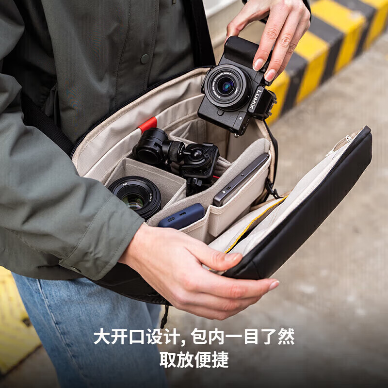 5、被某书种草来京东看这个牌子的,开始买了那个小的斜挎包,发现放不进相机跟镜头,需要把相机跟镜头拆开才能放进去,我的相机是a7c不算大,后面换了这个6L的,可以放进相机,还有一半空间,里面分层细节很到位,有不少意想不到的细节,包不算大功能齐全,手工手感都不错,必须写一篇评价,很少的写评价。PS:退换货还是很省心的,速度快。