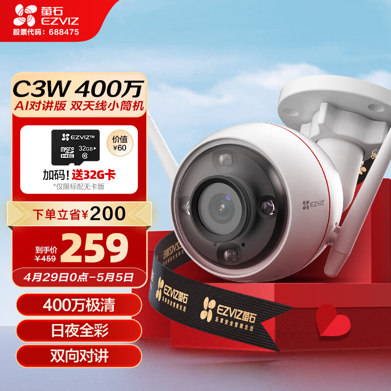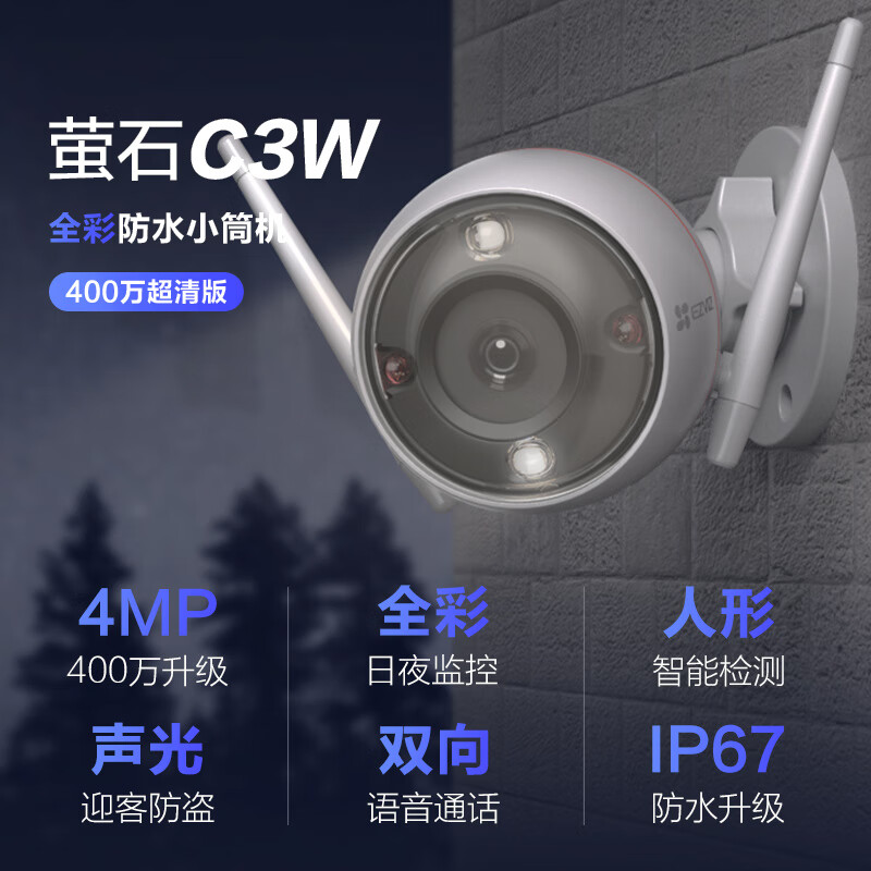 萤石C3W 4MP 2.8MM 400万超清日夜全彩超清监控 无线摄像头 室外IP67防水 AI人形检测 H.265编码价格:259.00元!