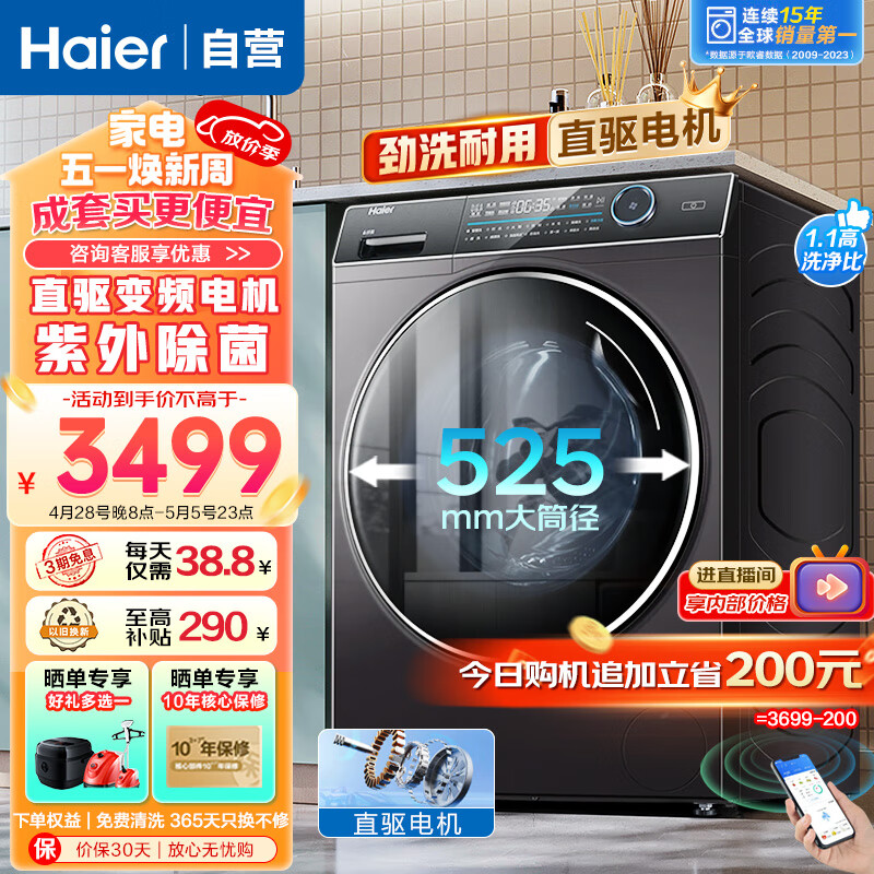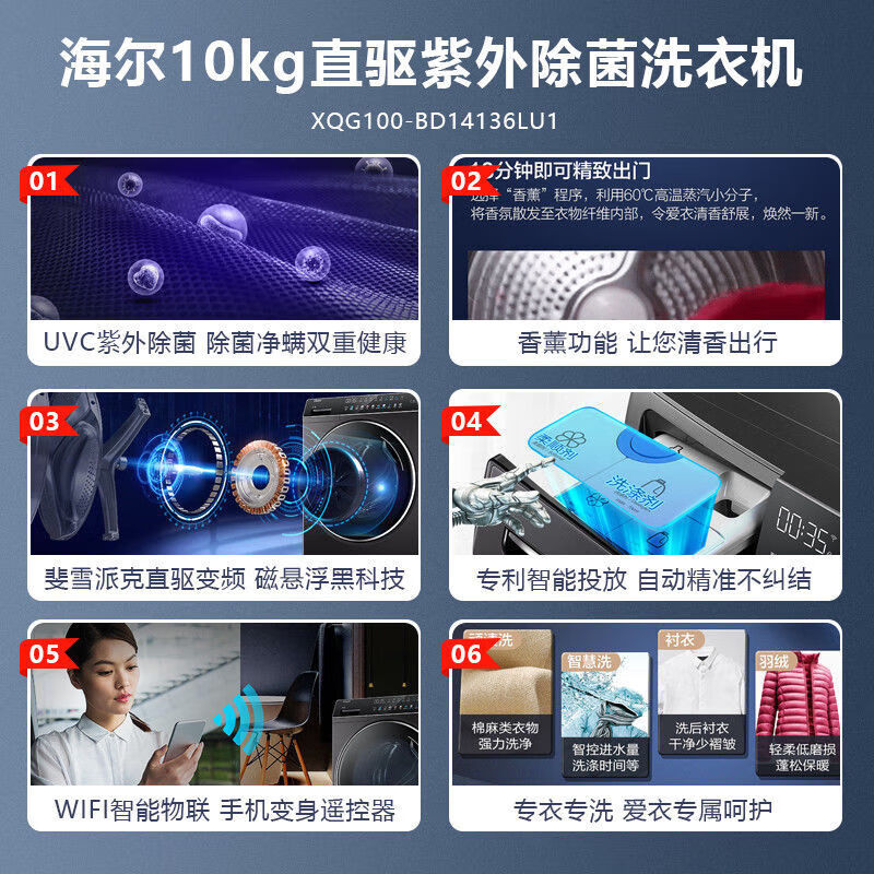 海尔(Haier)洗衣机全自动10KG直驱变频滚筒1.1洗净比家用紫外线杀菌香薰纤薄机身525mm大筒径智能投放价格:3499.00元!