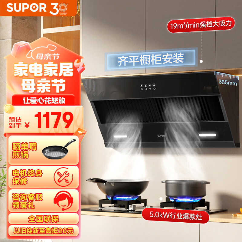 苏泊尔(SUPOR)抽油烟机燃气灶套装 家用小尺寸大吸力 19立方侧吸式小户型烟灶套装 DJ13S+Q5天然气价格:1179.00元!
