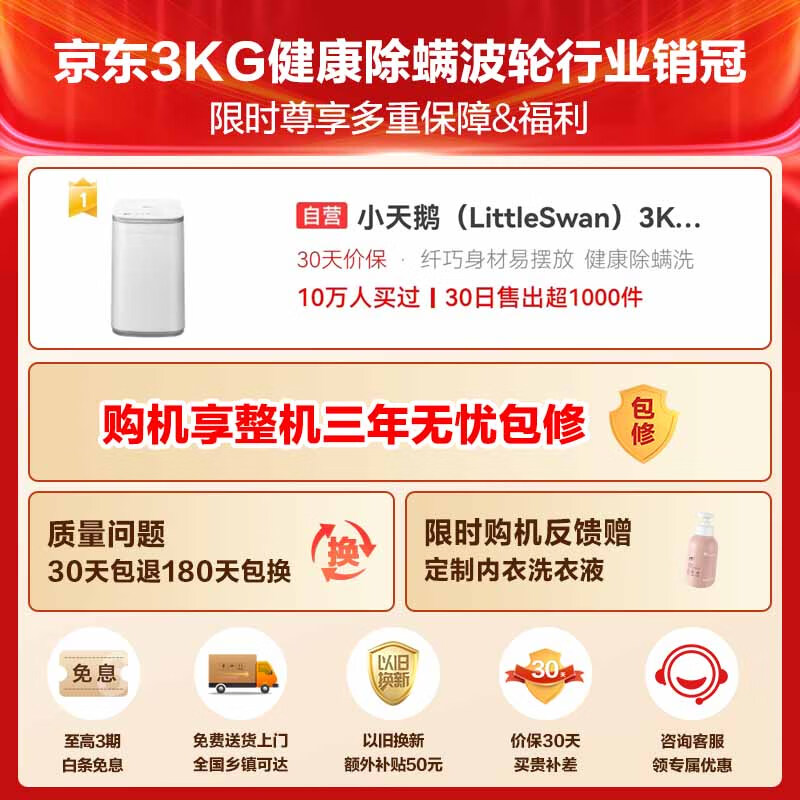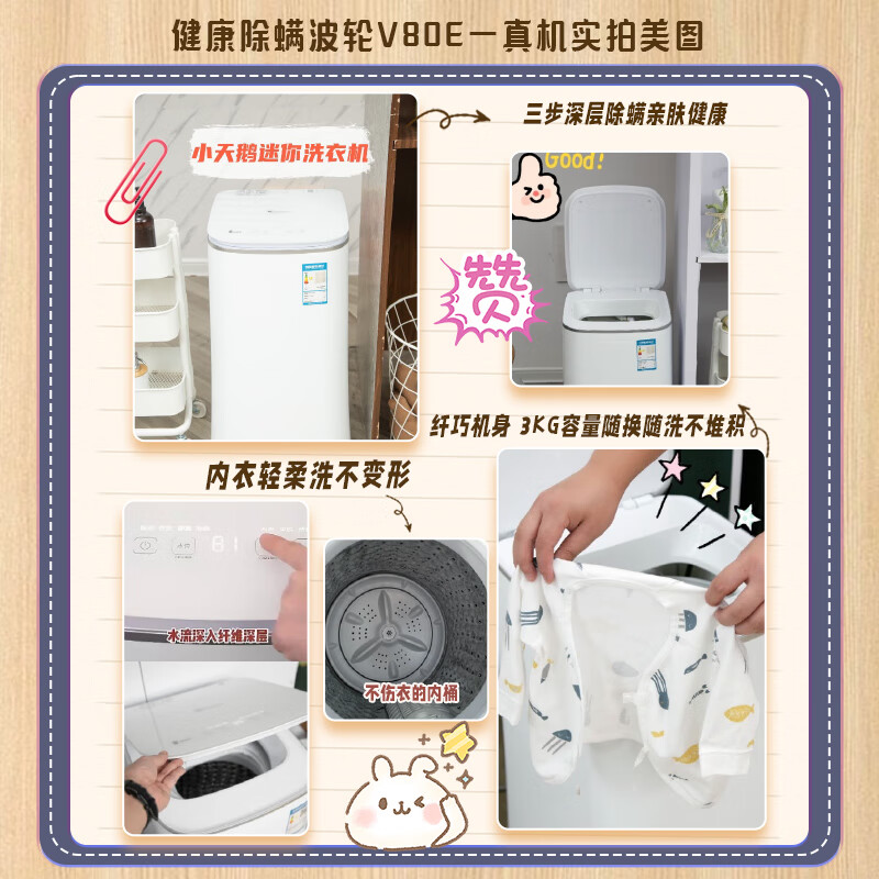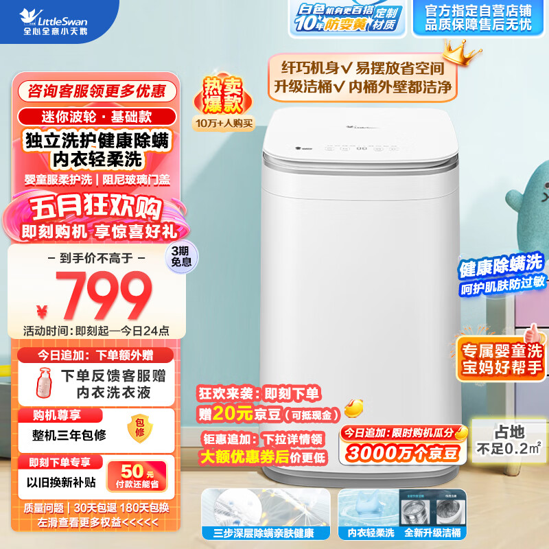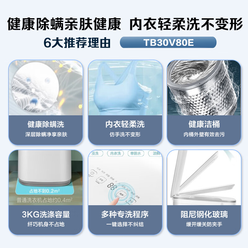 小天鹅(LittleSwan)3KG迷你洗衣机全自动 内衣裤洗衣机 小型迷你婴儿洗衣机 健康除螨洗 TB30V80E 健康洁桶价格:798.00元!