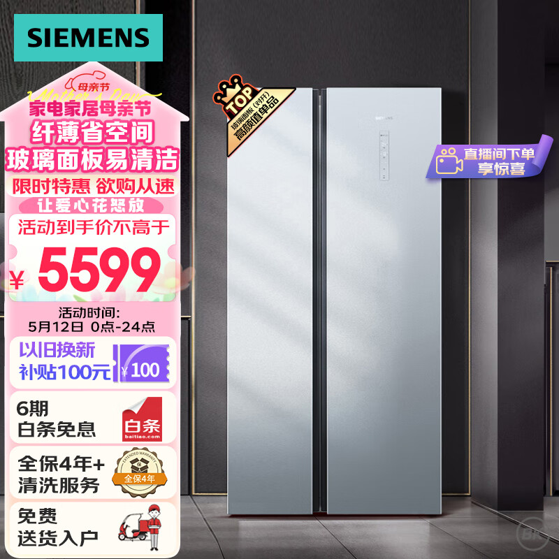 西门子(SIEMENS) 502升变频无霜对开双开门大容量家用冰箱超薄玻璃门晨雾灰以旧换新KA50SE43TI价格:5599.00元!