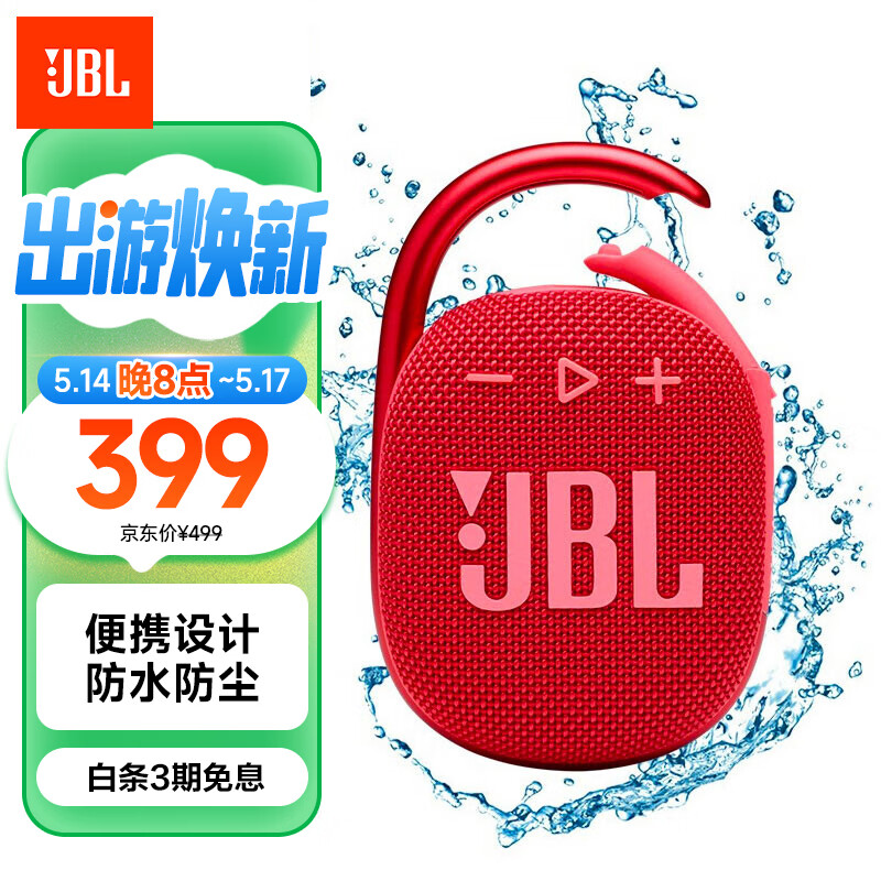 JBL CLIP4 无线音乐盒四代 蓝牙便携音箱 低音炮 户外迷你音箱 防尘防水 520礼物 小音响 红色价格:399.00元!