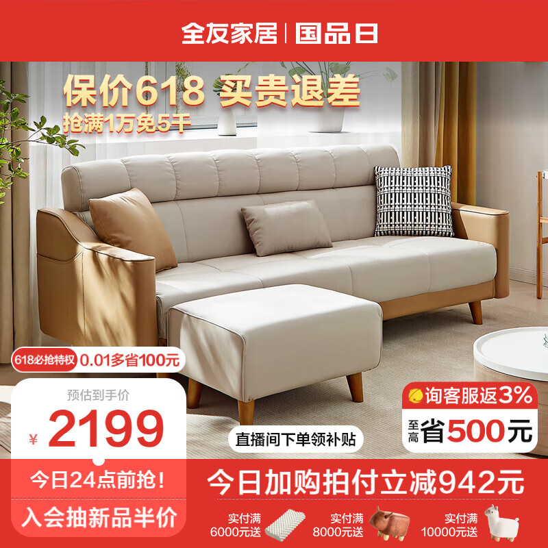 全友家居 沙发床北欧简约科技布沙发三人位可折叠两用沙发床111015价格:3141.43元!