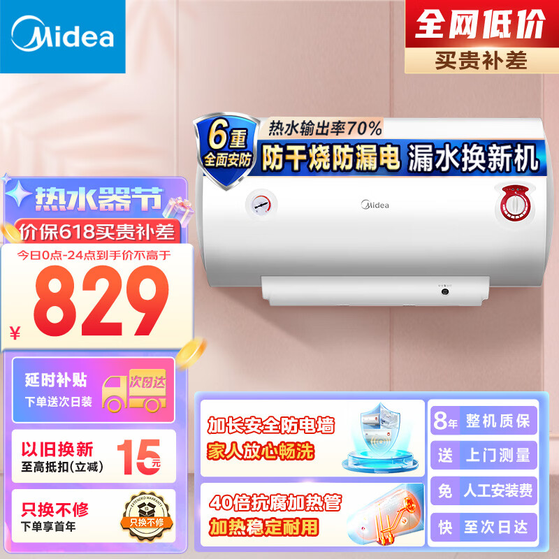 美的(Midea)热水器2100W速热耐用双重杀菌升级加长防电墙全屋漏电预警80升储水式电热水器F80-21WA1价格:829.00元!
