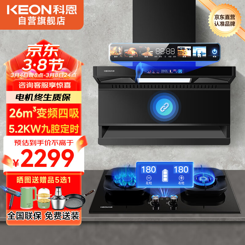 科恩(KEON)烟灶套装家用26m3变频三腔四吸抽油烟机5.2kw鸳鸯九腔定时燃气灶具两件套PY3-BL+JX1-JDL价格:2649.00元!