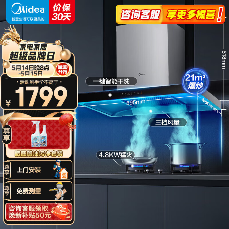 美的(Midea)欧式顶吸油烟机 厨房家用吸油烟机 21立方大吸力智能干洗自清洁油烟机烟灶套装T201-L+Q217B天然气价格:1799.00元!