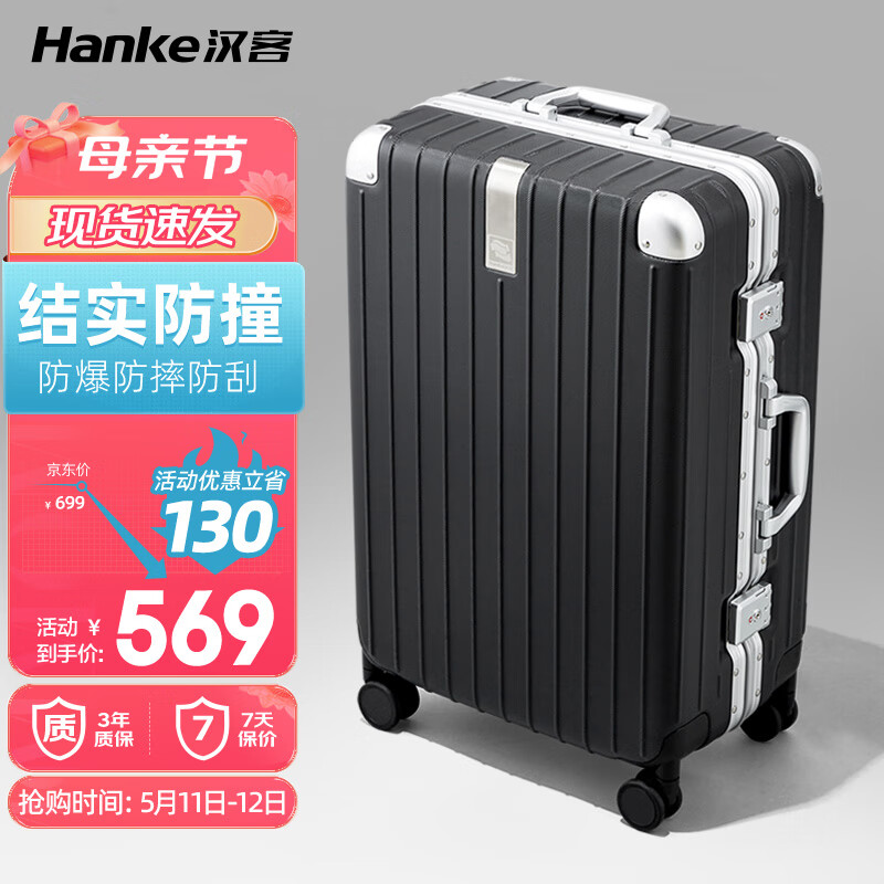 汉客行李箱铝框箱男拉杆箱女旅行箱大容量24英寸墨玉黑密码箱防爆耐摔价格:699.00元!