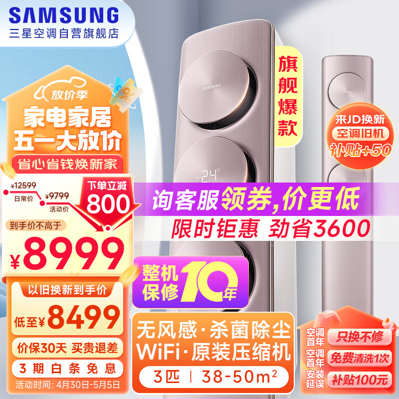 三星空调3匹新三级能效无风感柜机立式WIFI全直流变频除菌冷暖空调38-50㎡适用以旧换新KFR-72L/EBB3价格:8999.00元!