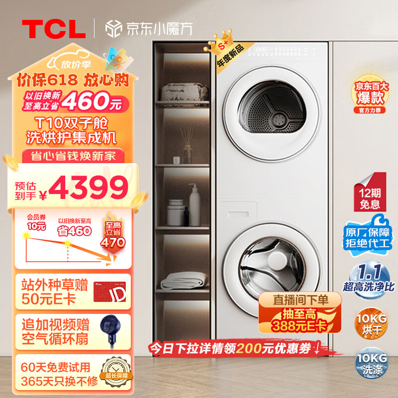 TCL GH200T10-W 双子舱洗烘护集成机一体式洗烘套装 超薄全嵌 10公斤滚筒+10公斤热泵烘干机价格:4599.00元!
