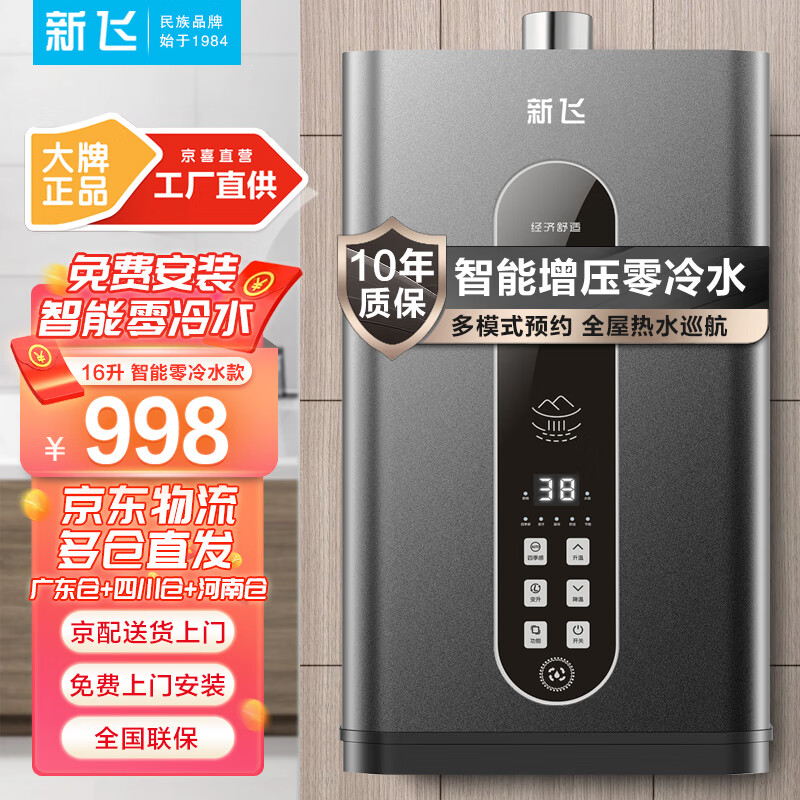 新飞16升 智能零冷水 燃气热水器 天然气 增压强排热水器 预约模式 热水巡航 即开即热 低水压启动 价格:998.00元!
