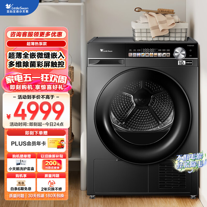 小天鹅(LittleSwan)10公斤热泵烘干机家用 全自动干衣机 超薄全嵌-纤彩 除菌除螨除潮 TH100HS81【小乌梅轻享版】价格:4999.00元!