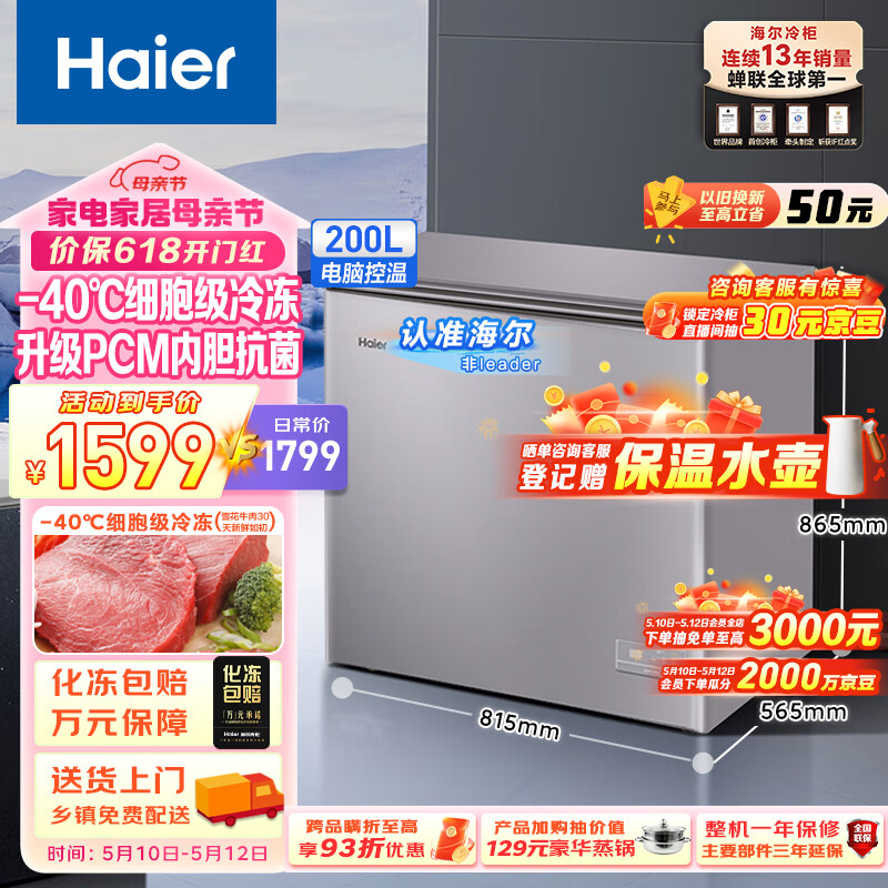 海尔(Haier)200升-40℃智控低霜小冰柜家用商用 冷藏柜冷冻柜冰柜小型小冰箱小型冷柜BC/BD-200GHEPC 以旧换新价格:1599.00元!