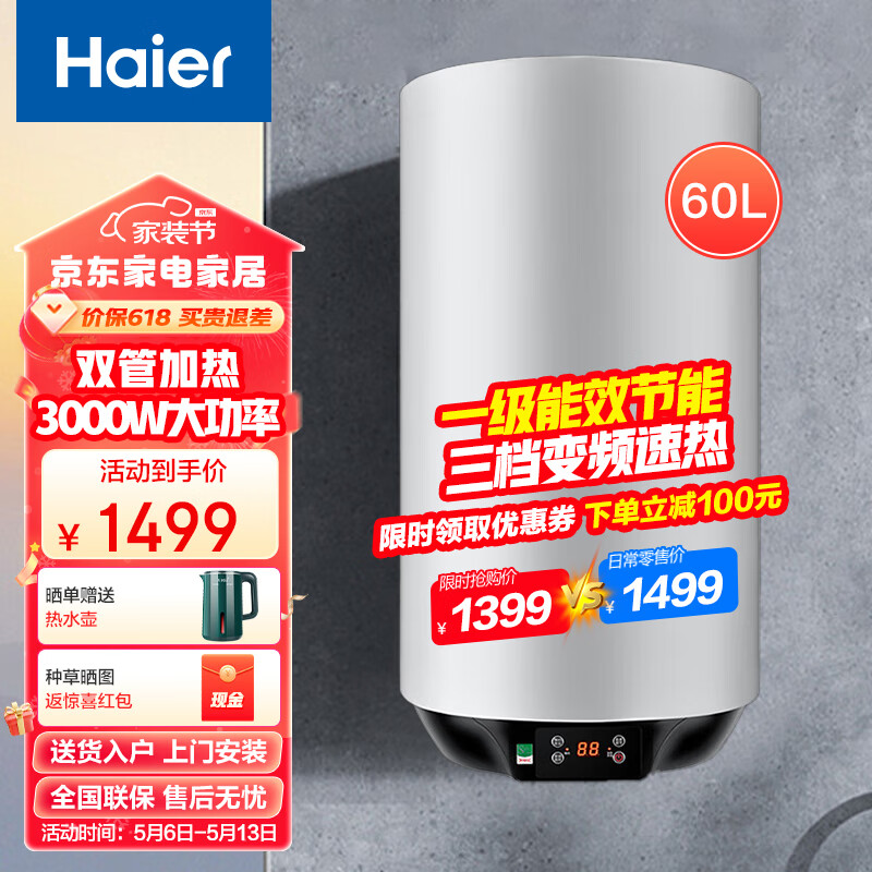 海尔(Haier)立式热水器 60升家用变频3000W速热竖式电热水器 一级能效节能即热储水式预约洗浴增容U1[家电]价格:1499.00元!