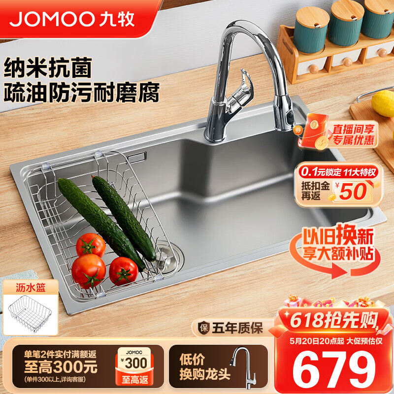 九牧(JOMOO)304不锈钢水槽纳米抗菌大单槽厨房洗菜盆75*45(无龙头)06212-BZ价格:779.00元!