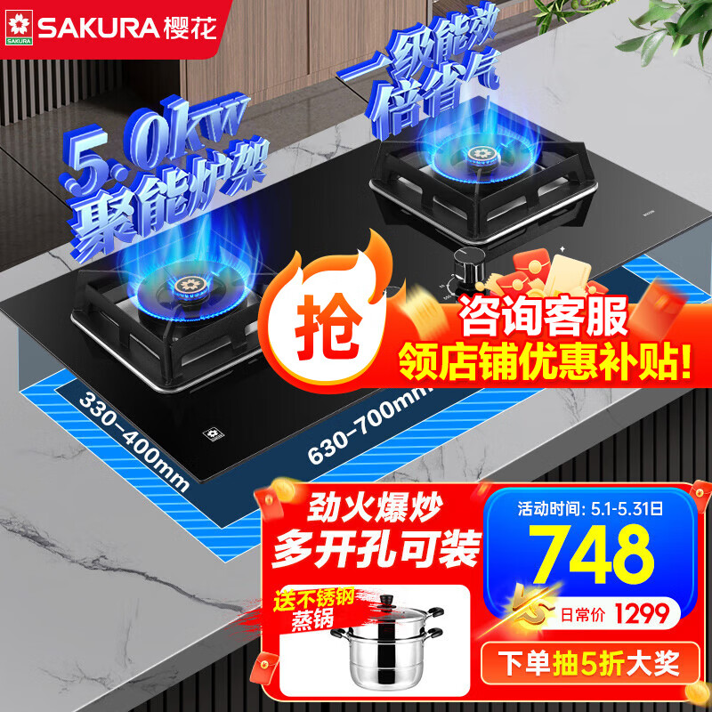 樱花(SAKURA)燃气灶天然气灶煤气灶双灶液化气灶具猛火炉灶台式嵌入式两用5.0KW大火力一级能效 【天然气】B9209大面板多种开孔尺寸价格:748.00元!