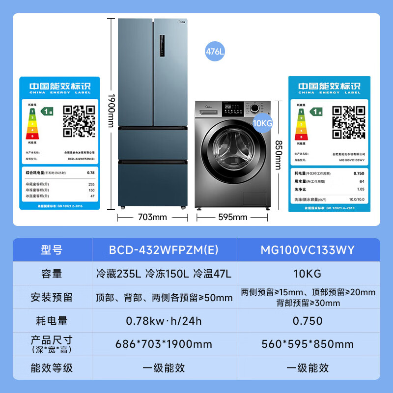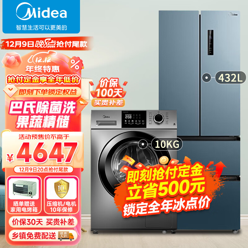 美的(Midea)冰洗套装 432法式多门冰箱+10公斤滚筒全自动洗衣机BCD-432WFPZM(E)+MG100VC133WY价格:4647.00元!