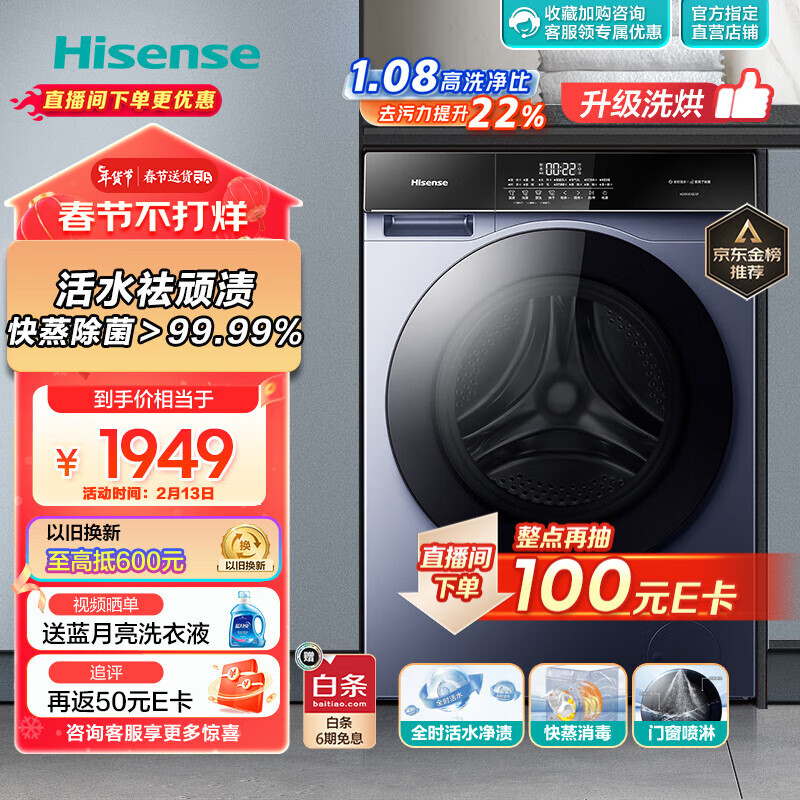海信(Hisense)滚筒洗衣机全自动10公斤洗烘一体BLDC变频纳米银离子超薄平嵌微蒸汽空气洗全时活水净渍 HD100DSE12F以旧换新价格:2149.00元!