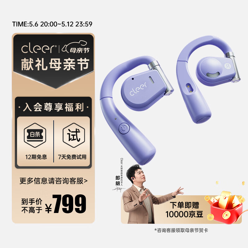 cleerARC音弧蓝牙运动跑步夹耳式耳机无线开车骑行骨传导升级开放挂耳式气传耳麦适用苹果华为节日礼物 紫罗兰【充电盒升级款-续航18H】价格:1099.00元!