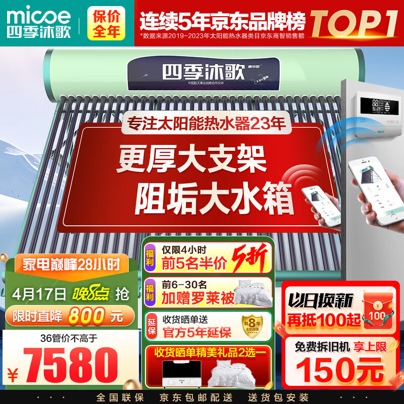 四季沐歌(MICOE)飞天豪华WiFi太阳能热水器家用光电两用自动上水 预约电加热 水温水位显示 带阻垢 大容量36管300L价格:8380.00元!