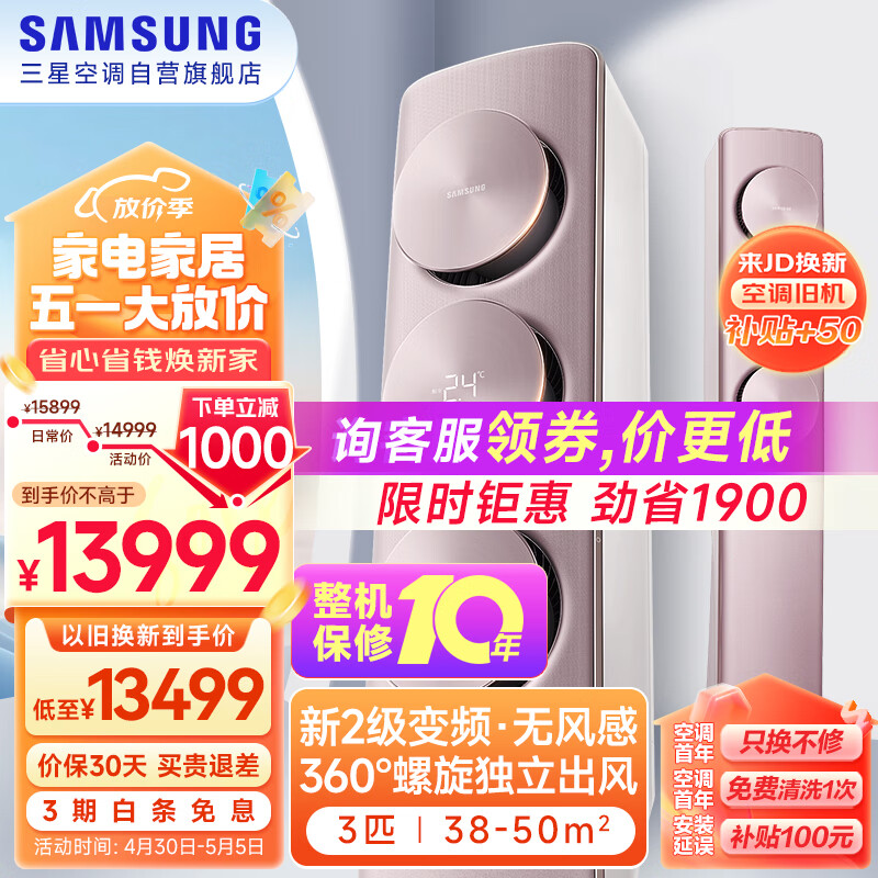 三星空调3匹新二级能效无风感柜机立式WIFI全直流变频除菌冷暖空调38-50㎡适用以旧换新KFR-72L/EBC2价格:14999.00元!