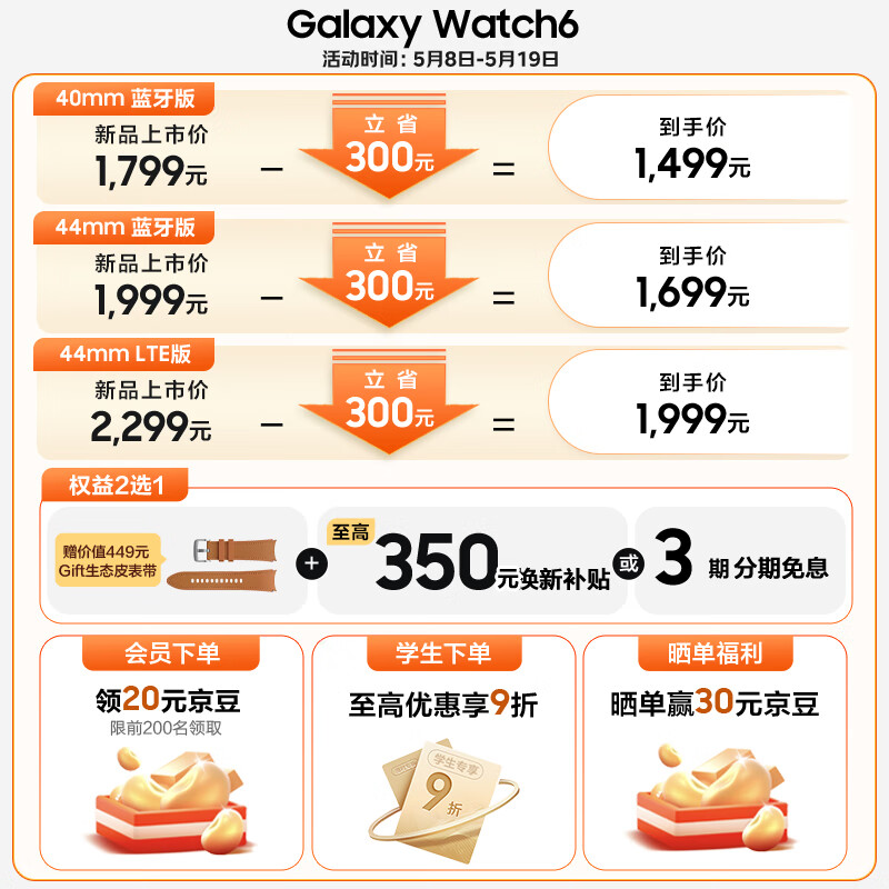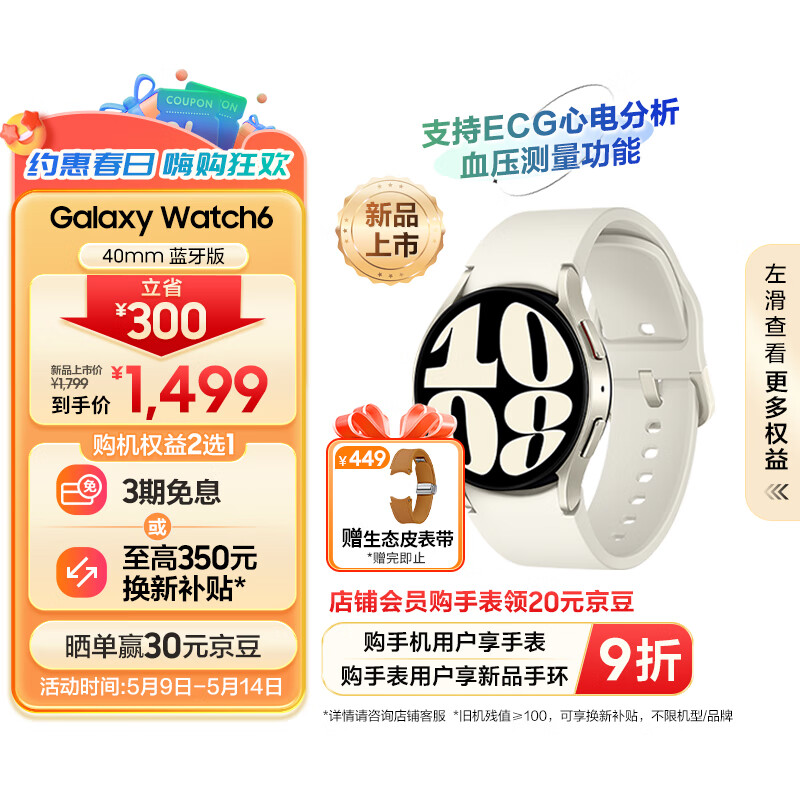 三星【母亲节送好礼】Galaxy Watch6 蓝牙通话/智能手表/运动电话手表/ECG心电分析 40mm 星河白价格:1489.00元!