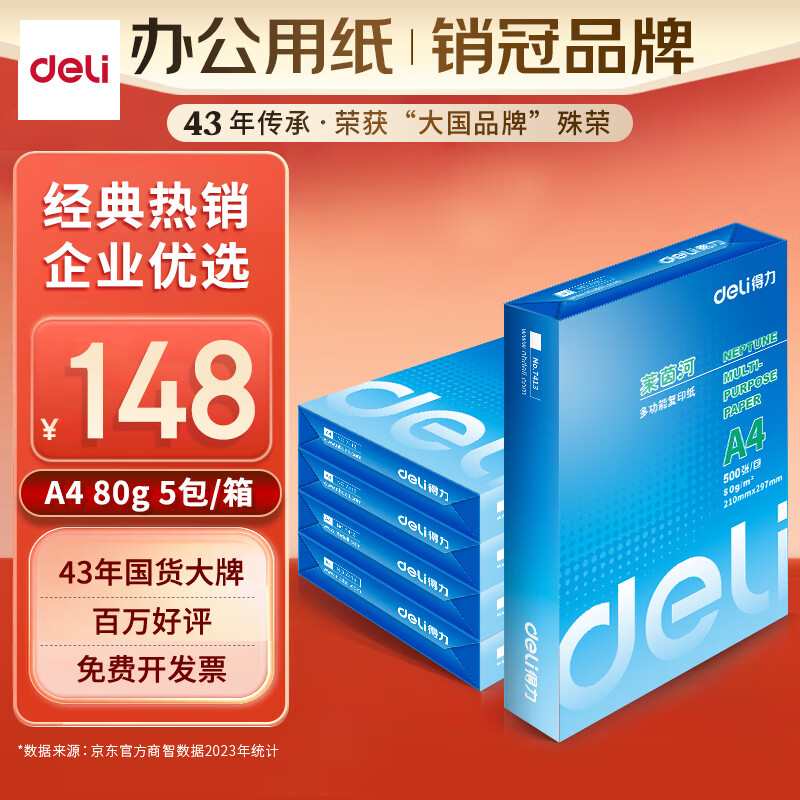 得力(deli)莱茵河A4打印纸 80g500张*5包一箱 口碑优选复印纸 双面加厚草稿纸 整箱2500张 7419【采购优选】价格:148.00元!