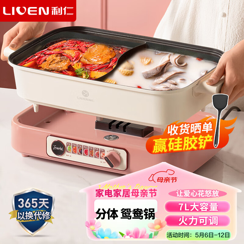利仁(Liven)鸳鸯锅电火锅专用锅电煮锅电锅多功能锅多用途料理锅分体式家用电热锅火锅锅7升大容量 DHG-700BY价格:239.00元!