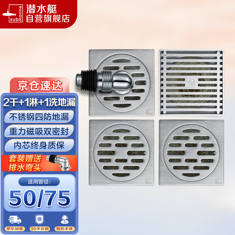 潜水艇(Submarine)不锈钢防臭地漏套装 50管高端地漏 大排量淋浴+2个干湿区+洗衣机价格:309.00元!