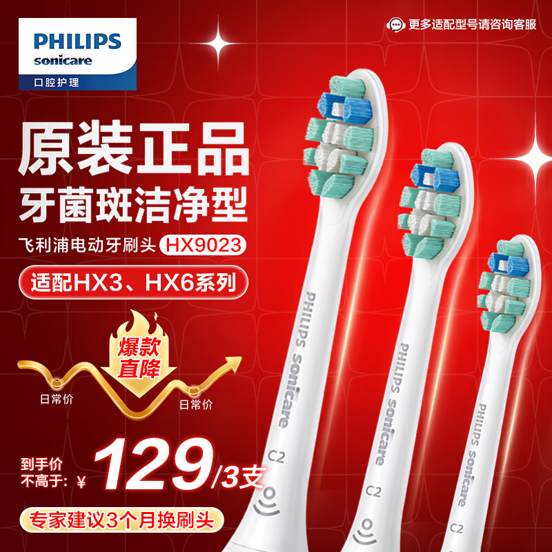 飞利浦(PHILIPS)电动牙刷头飞利浦牙刷头电动牙刷替换刷头HX6730牙刷头去除牙菌斑 HX9023/67牙菌斑清洁3支装价格:129.00元!