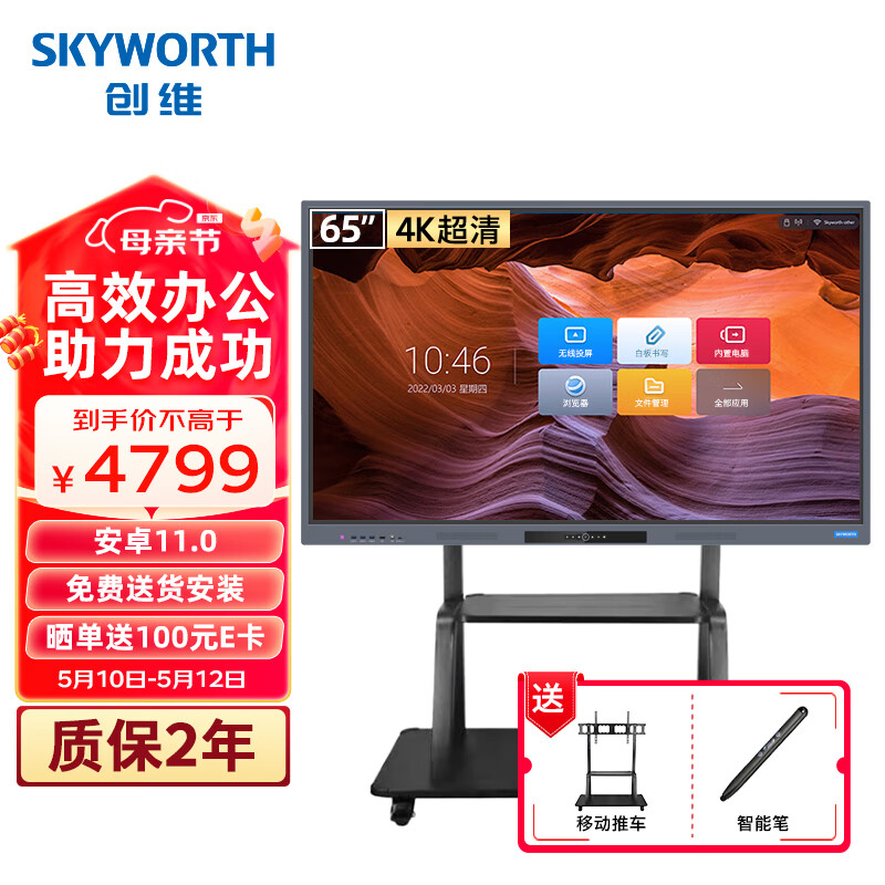 创维(Skyworth)65英寸会议平板 智能触控一体机 电子白板 无线传屏投影 视频触摸电视【商用显示】65DSH5移动支架价格:4799.00元!