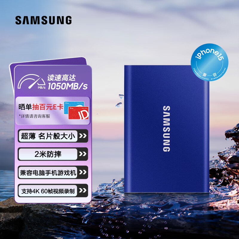 三星(SAMSUNG) 1TB Type-c USB 3.2 移动固态硬盘(PSSD) T7 蓝色 NVMe传输速度1050MB/s 超薄时尚价格:1029.00元!