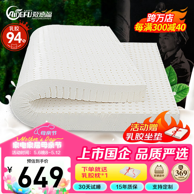 爱德福乳胶床垫泰国进口天然乳胶 榻榻米1.5m1.8单双人150*200*5(85D)价格:759.00元!