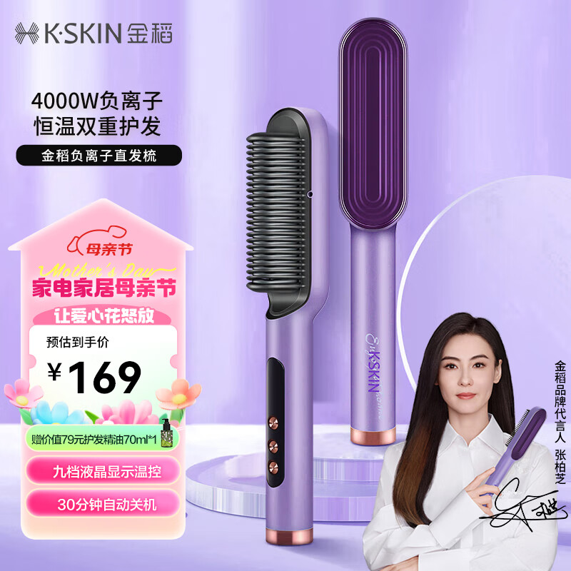 金稻直发梳负离子夹板卷发棒内扣直板夹造型梳子 4000万负离子护发30秒速热KD380K紫色 母亲节礼物女价格:249.00元!