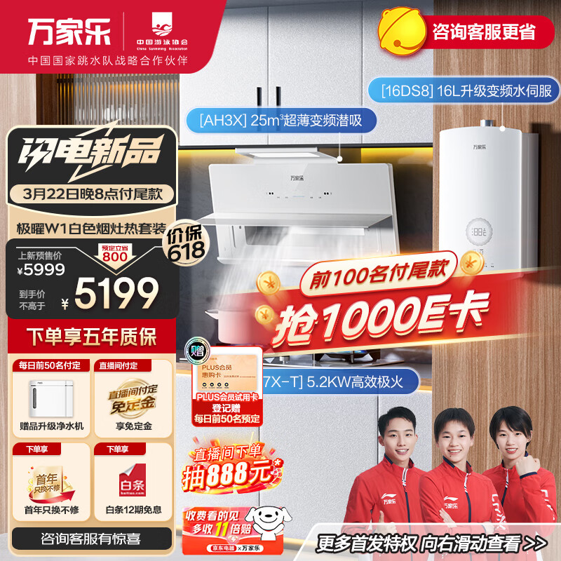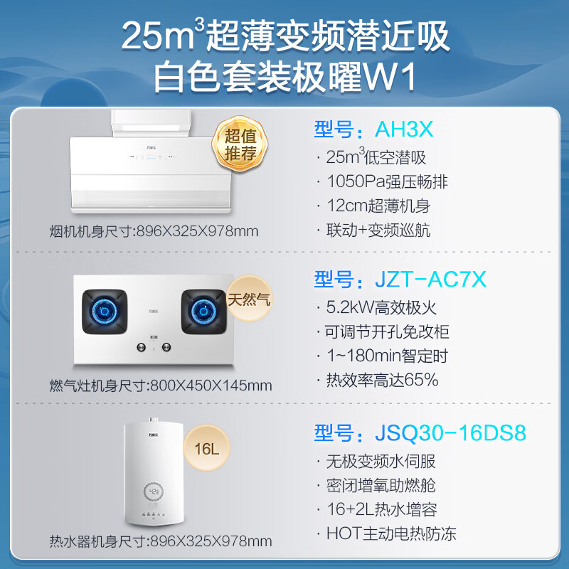 万家乐极曜W1烟灶热套装 25立方白色烟灶联动套装16L水伺服燃气热水器厨卫三件套AH3X+AC7X+DS8天然气价格:5199.00元!