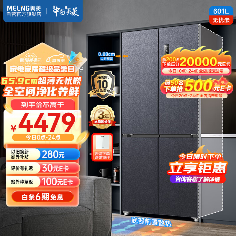 美菱(MeiLing)601升超薄零嵌入式十字双开对开四开门冰箱家用双变频一级能效风冷无霜BCD-601WPU9CT超大容量灰价格:4899.00元!