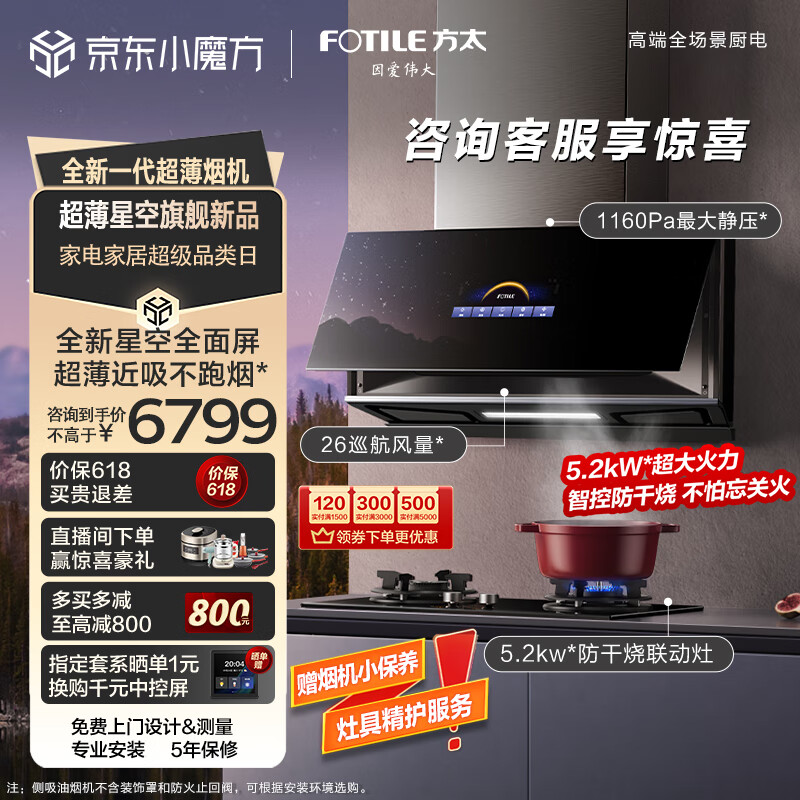 方太(FOTILE)抽吸油烟机灶具套装 侧吸式变频 26大风量 超薄近吸 烟灶联动 5.2kw防干烧 换装双灶P10.i+THK21B价格:6799.00元!