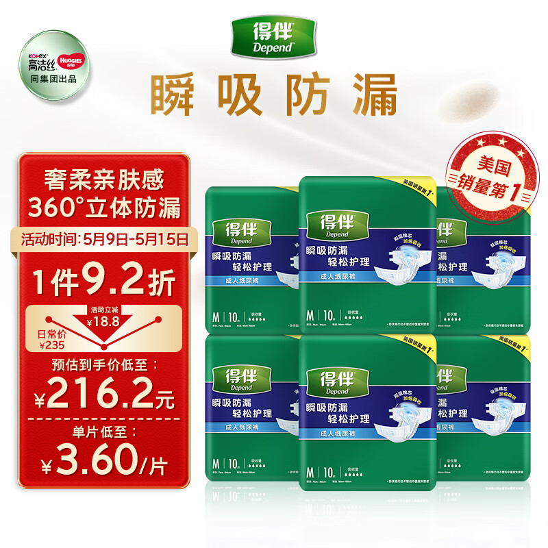 得伴Depend老年人尿不湿男女成人纸尿裤 孕妇 臀围80-105cm M60片价格:235.00元!