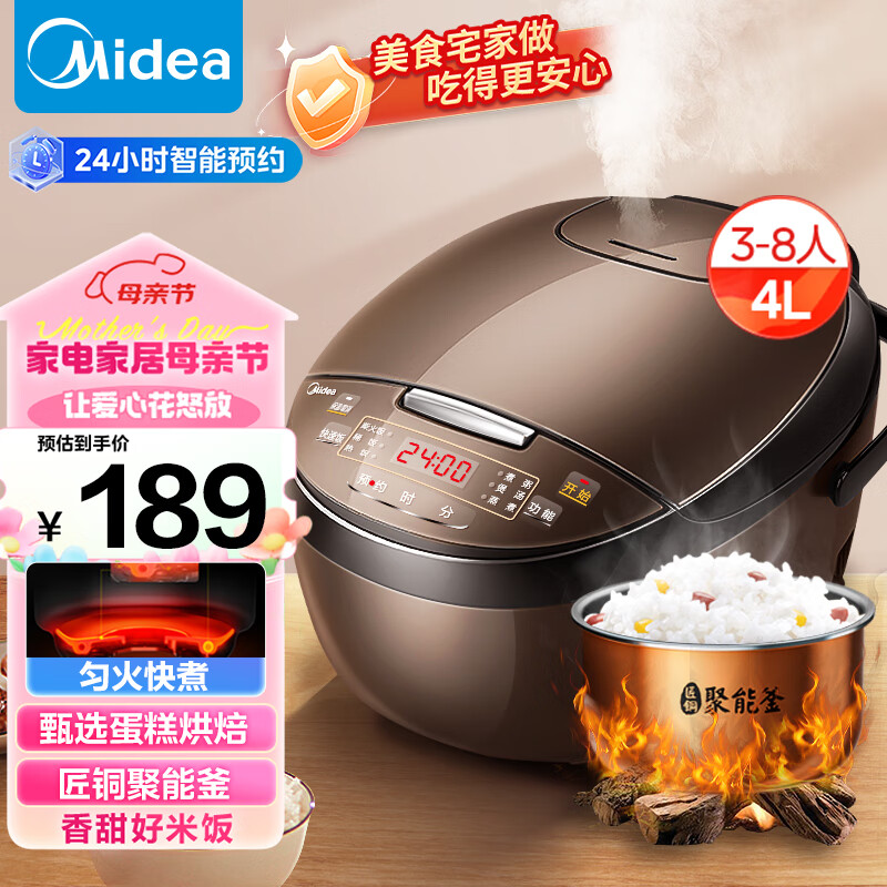 美的(Midea)智能电饭煲电饭锅家用4L可拆蒸汽阀24H预约蒸煮米饭锅FB40simple111(3-8人)价格:189.00元!