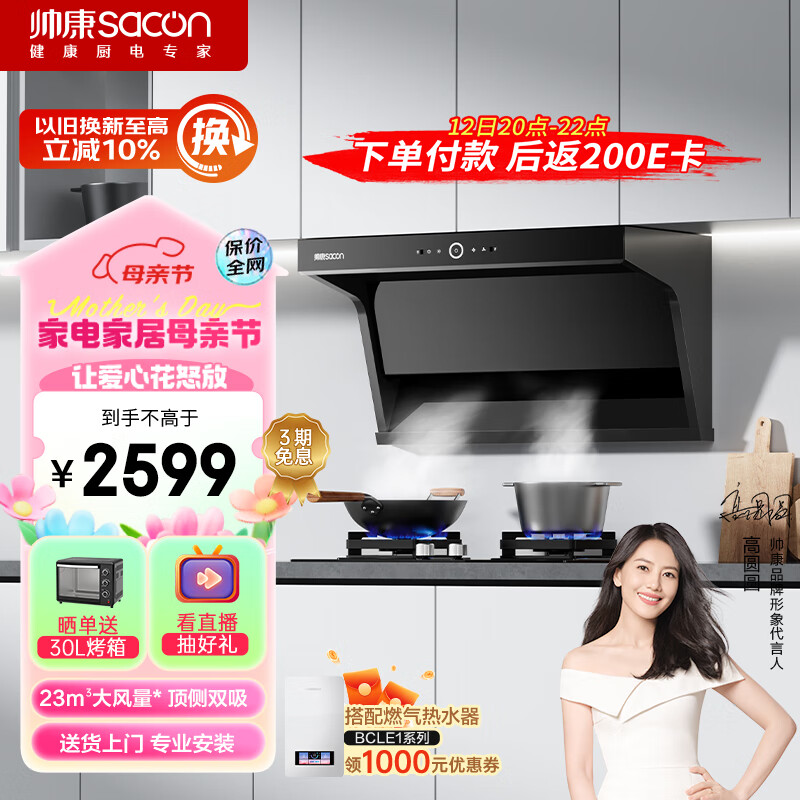 帅康(Sacon)抽油烟机顶侧双吸油烟机 抽油烟机燃气灶套装 家用23大风量烟灶套装7字机 Y8272+61C天然气价格:2599.00元!