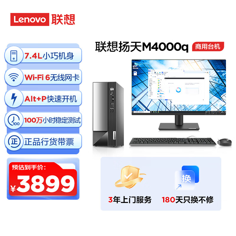 联想(Lenovo)扬天M4000q 商用办公台式电脑主机(酷睿13代i5-13400 16G 1TB SSD)21.45英寸价格:3899.00元!