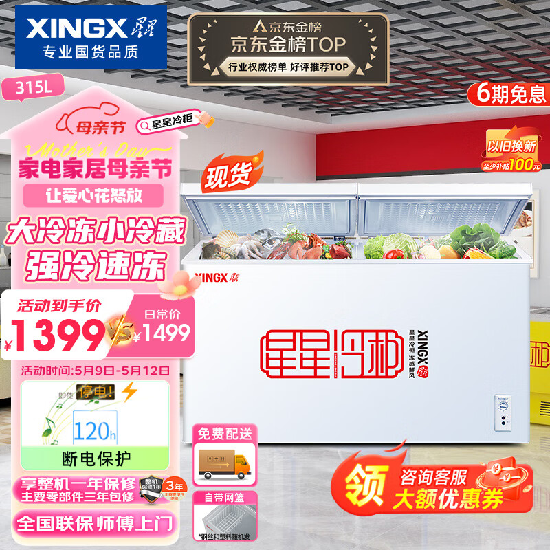 星星(XINGX) 315升 双温双箱冰柜 大冷冻小冷藏 卧式冰箱 大容积商用顶开门冷柜 BCD-315JE价格:1399.00元!