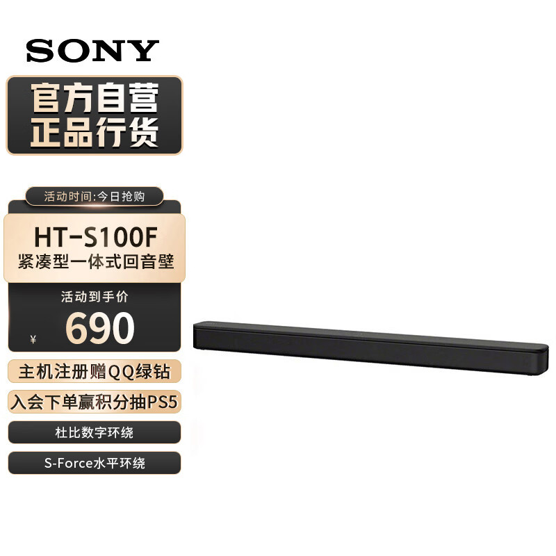 索尼(SONY)HT-S100F 一体式 杜比音效 回音壁 soundbar 家庭影院 电视音响 蓝牙音响 无线音响 ARC价格:690.00元!