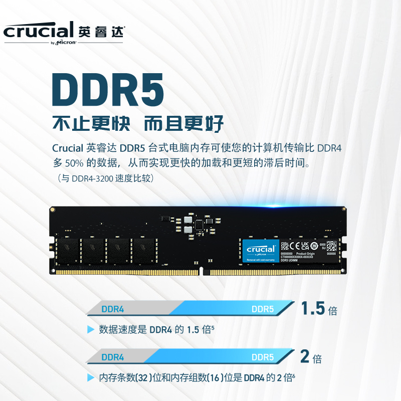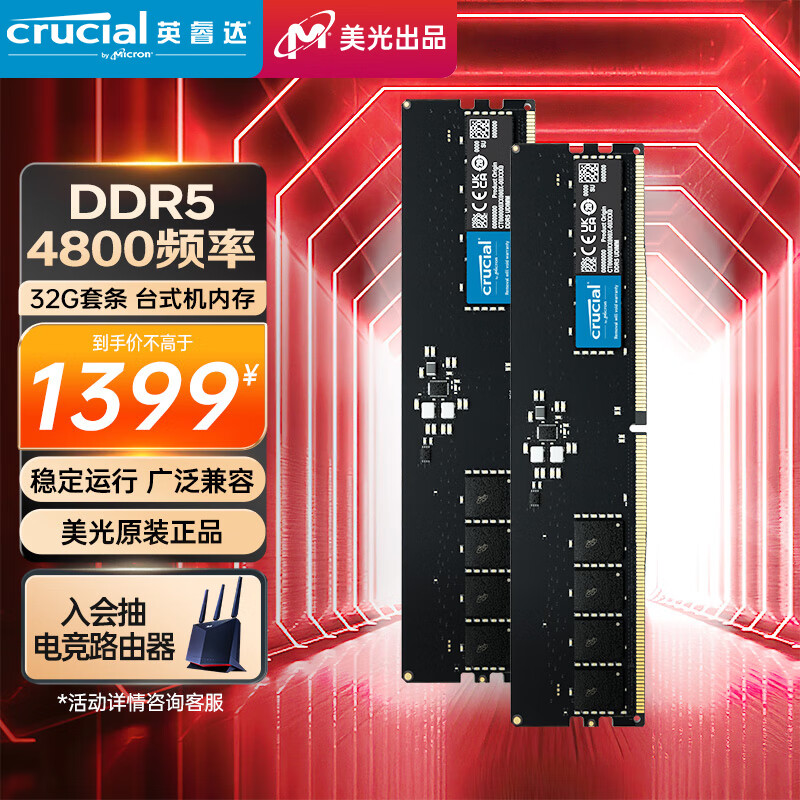 Crucial英睿达 64GB(32GB×2)套装 DDR5 4800频率 台式机内存条 美光原厂颗粒 助力AI价格:1399.00元!