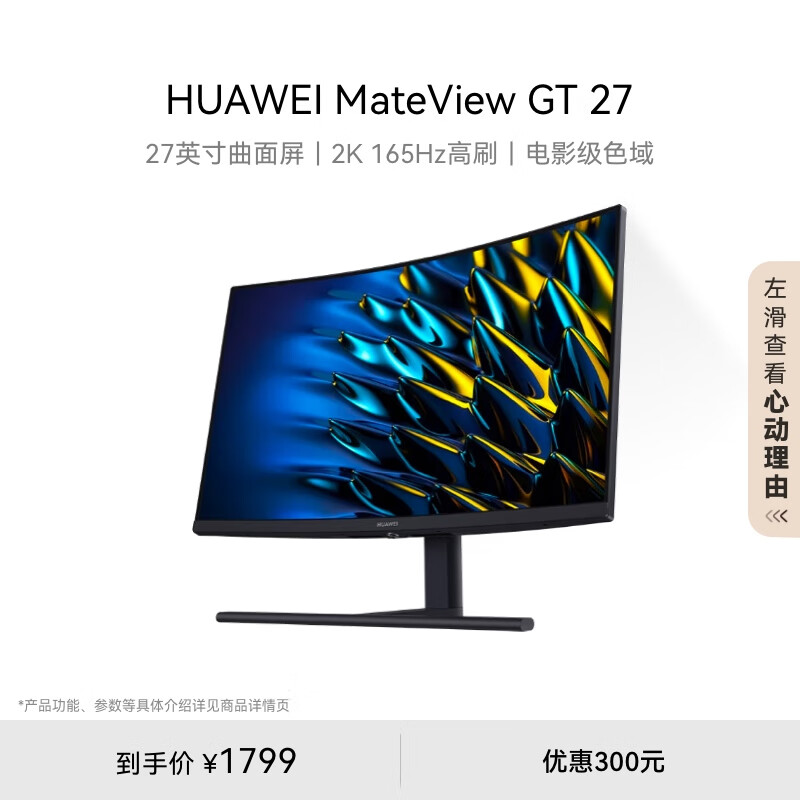 华为MateView GT 27英寸曲面显示器 2K 165Hz 可壁挂 低蓝光无频闪 升降俯仰调节 游戏电竞办公价格:1799.00元!