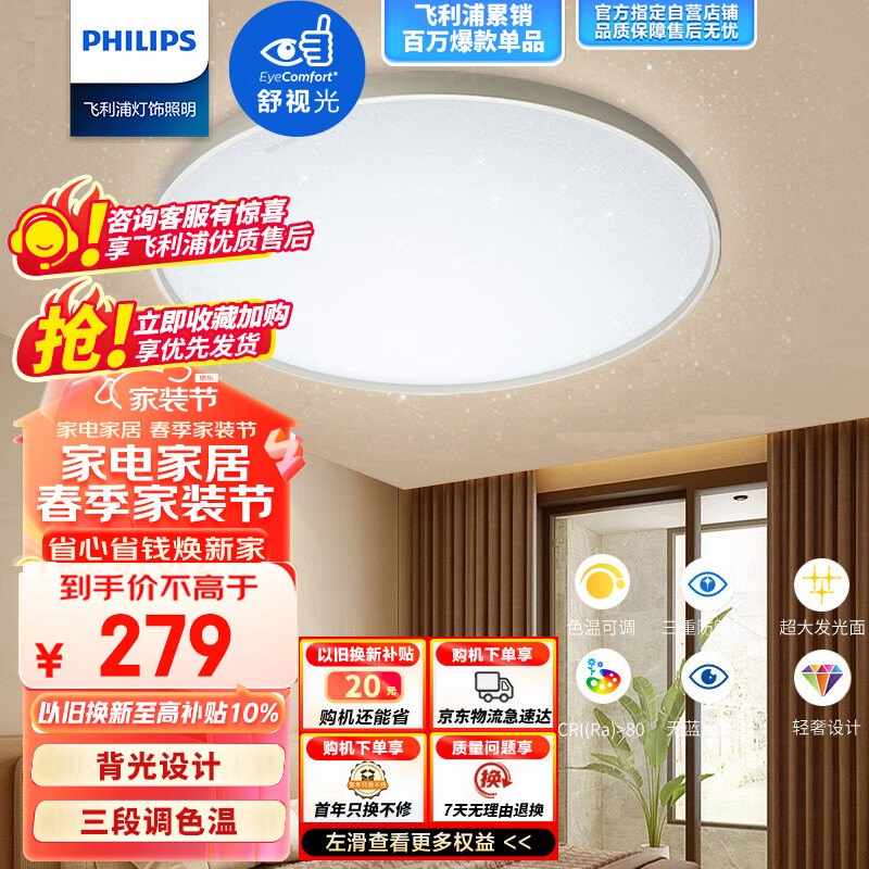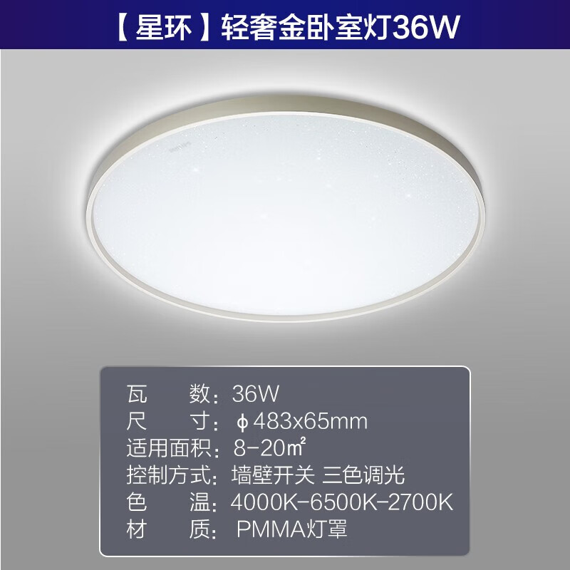 飞利浦(PHILIPS)led卧室灯吸顶灯房间主卧书房客厅现代简约灯具36W三色 星环金边价格:349.00元!