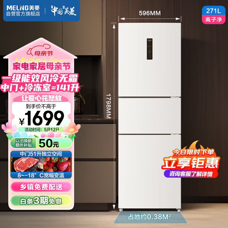 美菱(MeiLing)271升三门三开门冰箱家用变频一级能效节能省电风冷无霜低噪租房白色小冰箱BCD-271WP3CX以旧换新价格:1697.00元!