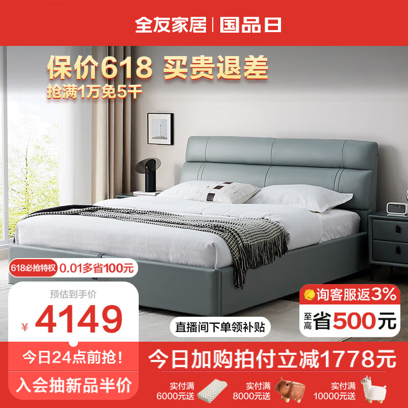 全友家居 真皮艺床头层牛皮现代简约主卧室双人大床高箱储物床105251价格:5927.14元!